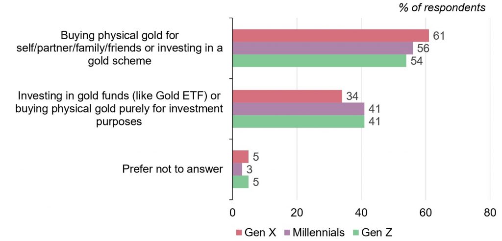 The survey highlighted that 58% of urban respondents plan to purchase gold for personal/family use either in physical form or through a gold scheme (such as Tanishq Golden Harvest Scheme), and 38% plan to buy gold for investment purposes either through gold funds or in physical form. Across the age groups Gen X are more likely to buy gold for personal use while Gen Z and millennials are more likely to buy gold for investment purposes (Chart 3).