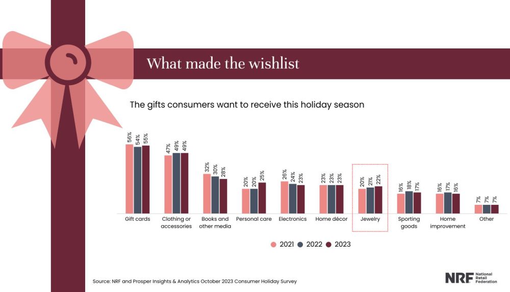 The survey notes that jewellery is among the top gifts that consumers wish to receive this holiday season. Desirability for jewellery has been steadily increasing, with 23% of surveyed consumers wanting jewellery in 2023, 21% in 2022, and 20% in 2021.