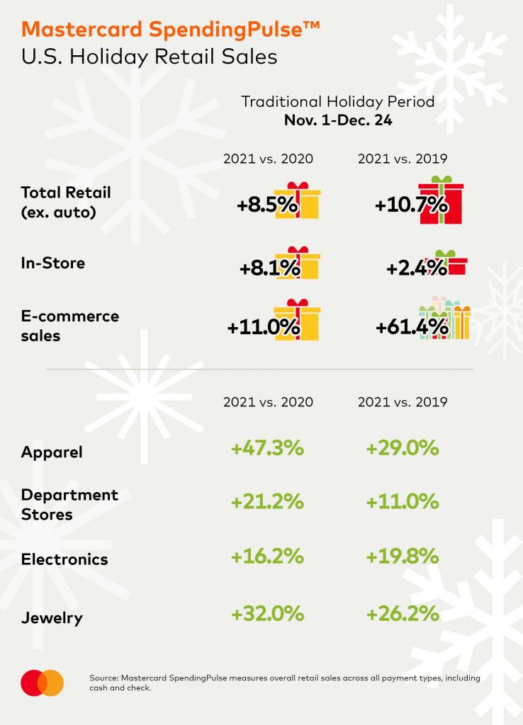 Findings from Mastercard SpendingPulse underscore the strength of the holiday shopper across channels, with consumers returning to stores (+8.1% YOY), and e-commerce continuing to expand, up 11% compared to 2020.