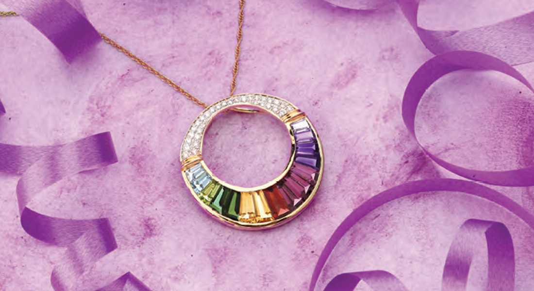 Vaibhav has effectively used gradient colour rubies, emeralds, sapphires, green and pink tourmalines, tsavorites, peridots, amethysts, citrine, aquamarine, garnets, and blue and yellow topaz in his collection.