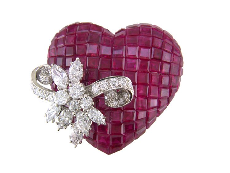 The stunning heart-shaped jewel is populated with invisibly set 147 sqaure blood red rubies, and features a floral bow set with marquise and round diamonds. By Oscar Heyman