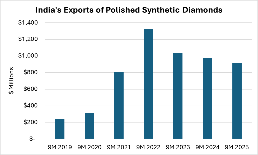 Wholesale prices dropped 37% year on year in the third quarter, according to Edahn Golan’s LGD Wholesale Price List, indicating that India, the largest producer of CVD goods, supplied higher volumes at lower prices during the period.