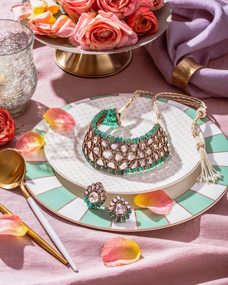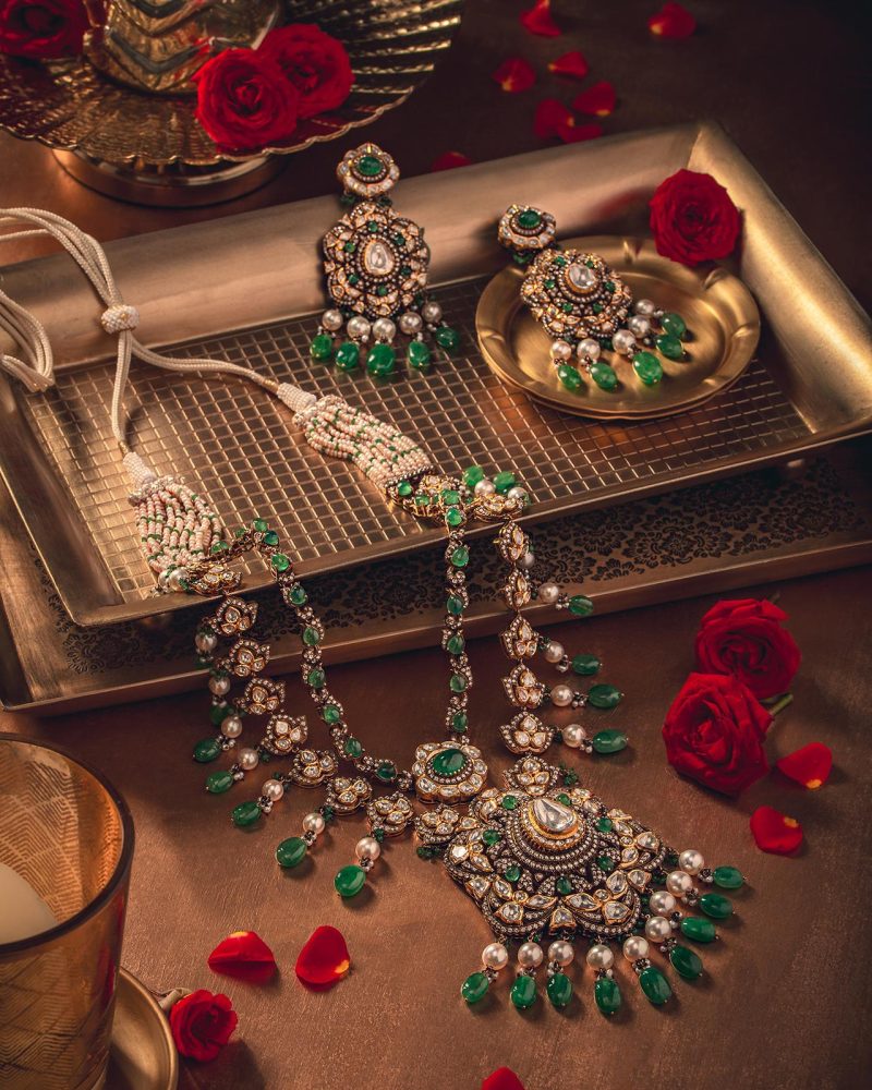 Flora and fauna form the core themes of the neckpiece, earrings and a singular bangle. Adorned with polkis, diamonds and emeralds, the jewels help you shine bright during this Diwali. By HOUSE OF SPARSH
