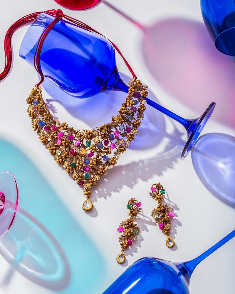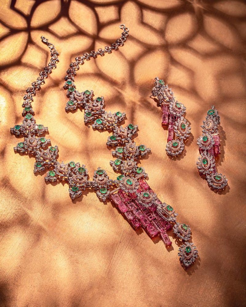 What sets this necklace set apart is the placement of gems that create alluring motifs. The versatile collection can complement any ensemble. By THE HOUSE OF RAMBHAJO’S