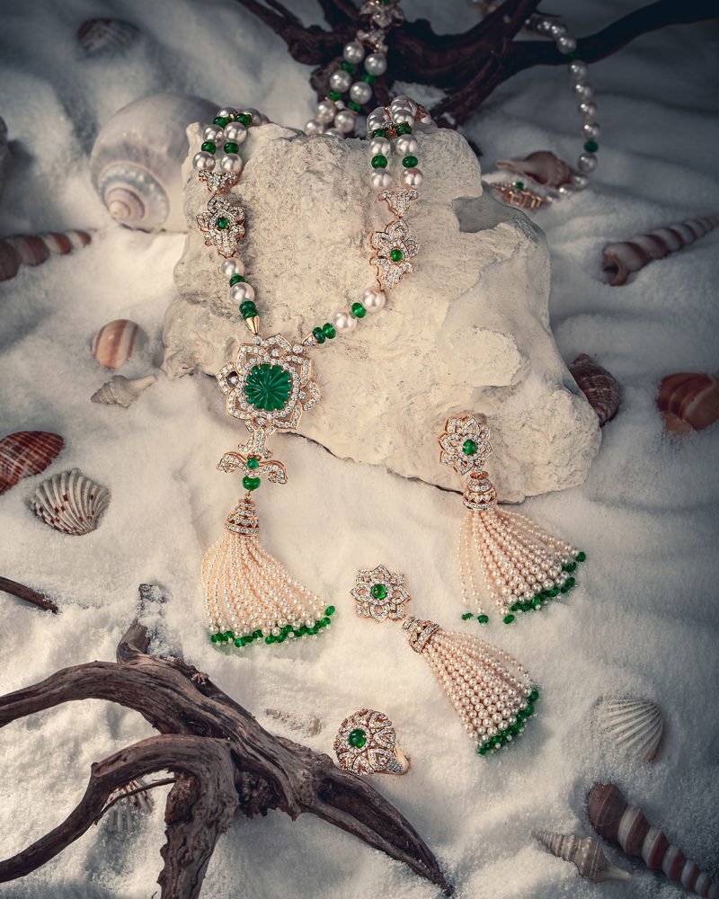 The timeless allure of pearls and emeralds is gracefully entwined in this stylish sautoir and earrings. Completing the set is a cocktail ring embellished with diamonds and emerald. By EXQUISITE FINE JEWELLERY