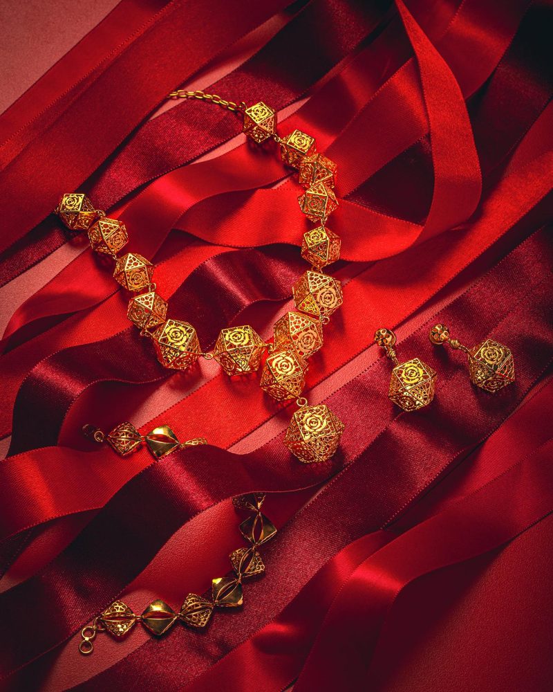 The diamond-studded necklace, and a range of earrings, all set in 18-karat gold are accented with rubies and emeralds. These jewels are sure to add a touch of sparkle to the festivity. By GOLD STAR JEWELLERY