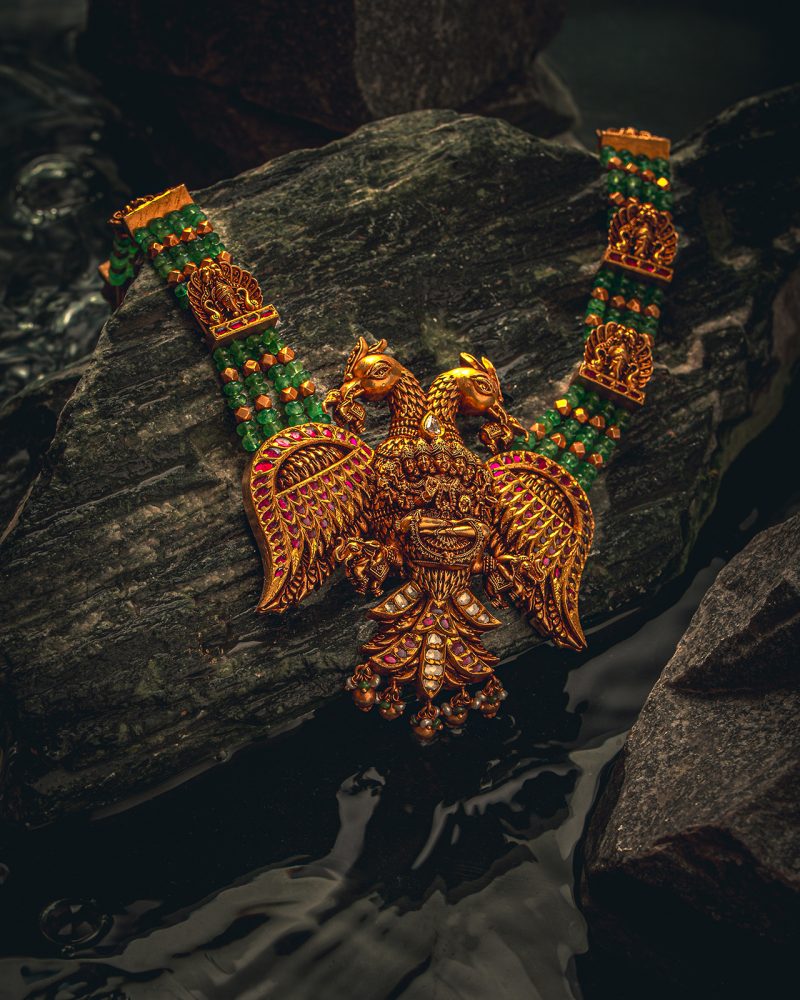 The beautifully handcrafted gold necklace enhanced with emeralds features a genda bherunda pendant. By MEHTA GOLD BY SANDEEP MEHTA