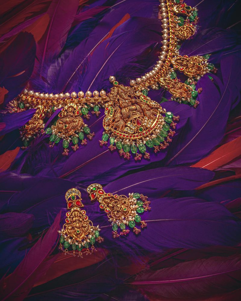 Traditional styles never go out of vogue. Here’s an example of a temple jewellery necklace and matching earrings that feature minute detailing of the hand carvings. By SHANTI S. SETH JEWELLERS