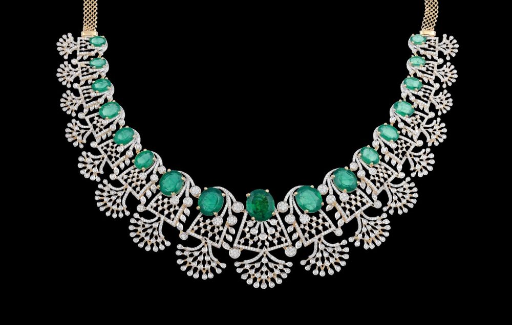 A scalloped diamond necklace, accented with a row of emeralds, is a shining example of illusion-set craftsmanship. By PNG Jewellers