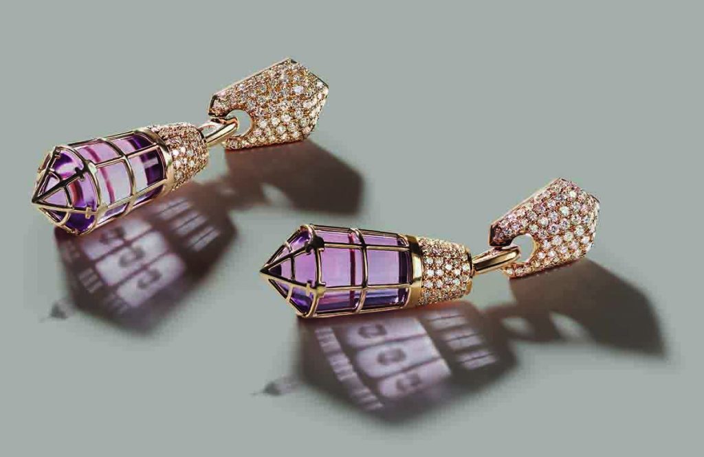 The symmetrical lines of the Florence Baptistery are envisioned with contemporary accents. Flawless amethysts have been custom cut in tapering octagon shapes and carefully grooved before being cushioned in the earring in a striking geometry of ink gold.