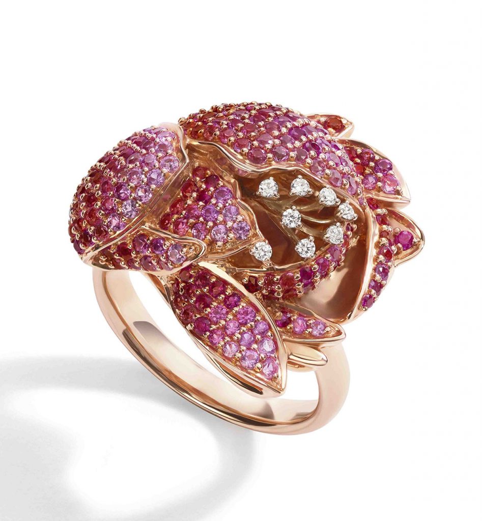 The Peonies white gold ring from the Musee du Luxe collection is set in a gradient of diamonds and rubies with the micro-pave technique.