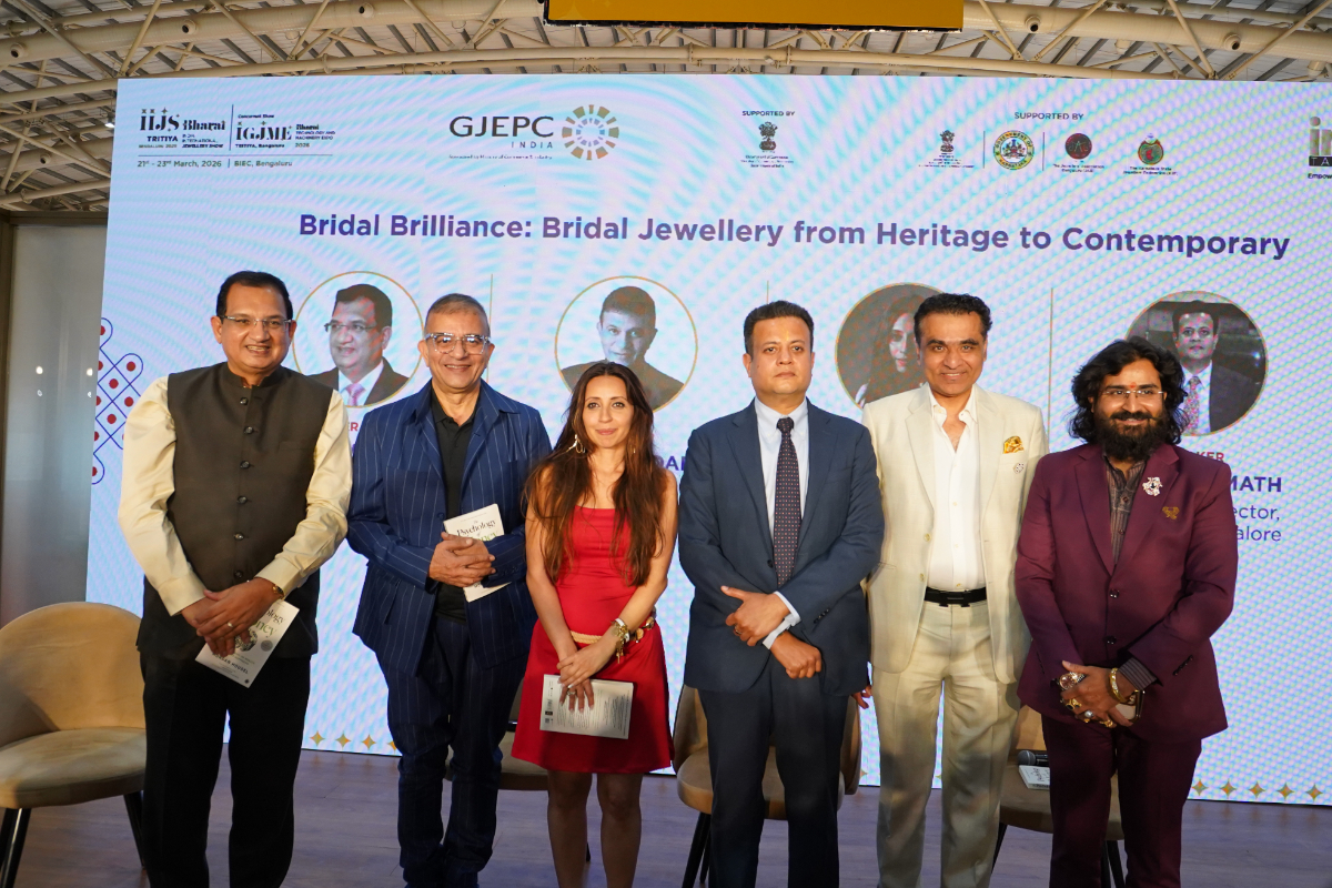 Mr. Sabhyasachi Ray - Executive Director, GJEPC, Mr. Nirav Bhansali - Convener, National Exhibitions - GJEPC, Dr. B. Govindan - Chairman, Bhima Jewellery, ... Dr. Selvakumar, IAS - Principal Secretary to Government, Commerce & Industries Department, Government of Karnataka, Mr. Vipul Shah - Chairman, GJEPC, Mr. Vinod Hayagriv - MD & Director, C. Krishniah Chetty Group, Mr. Kirit Bhansali - Vice Chairman, GJEPC, Dr. Chetan Kumar Mehta - National Vice President, IBJA and President, The Jeweller's Association Bangalore unveiling the Visitor Guide of IIJS Tritiya 2024 Read More